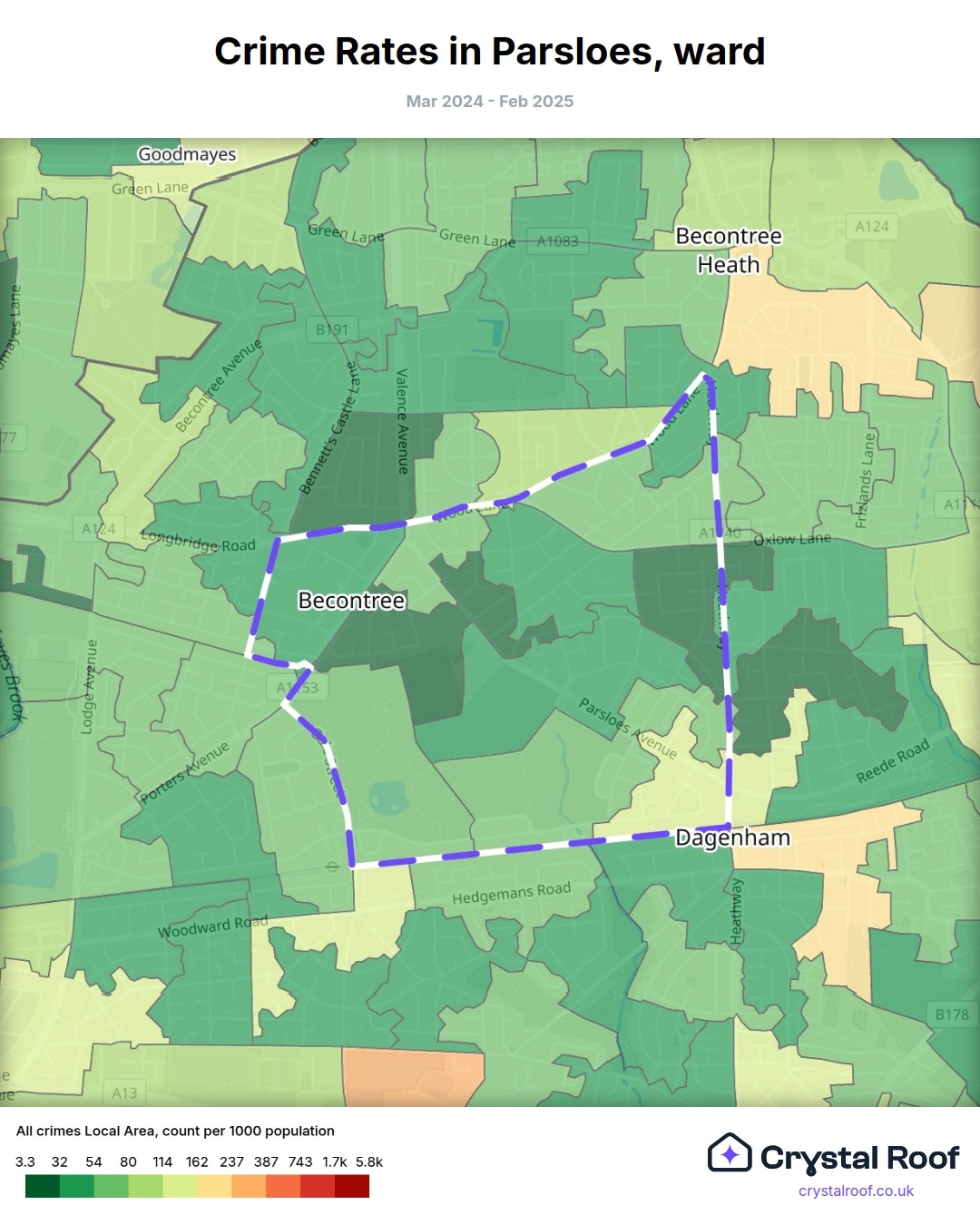 Parsloes, (ward) includes areas with the following crime ratings (see map):