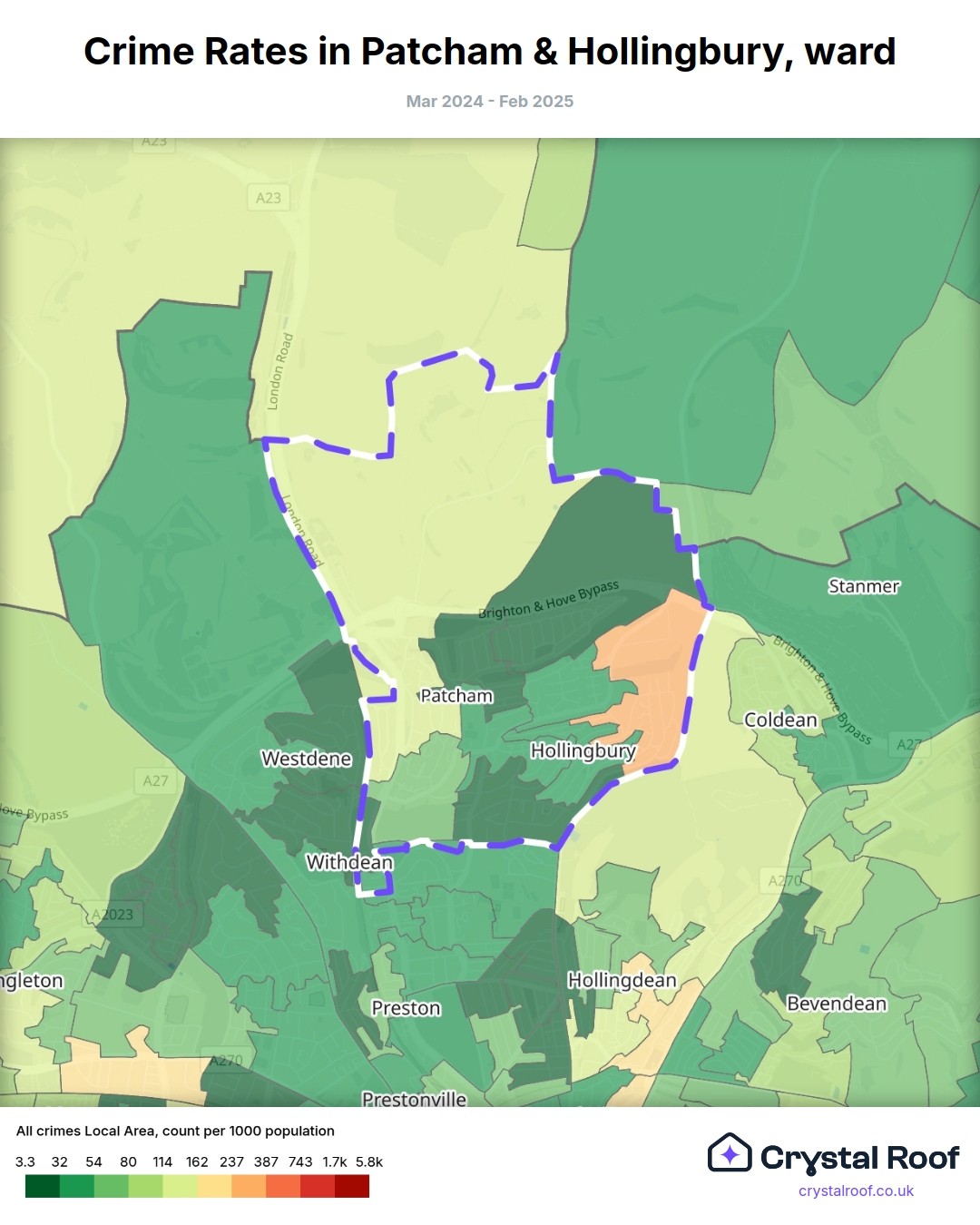 Patcham & Hollingbury, (ward) includes areas with the following crime ratings (see map):