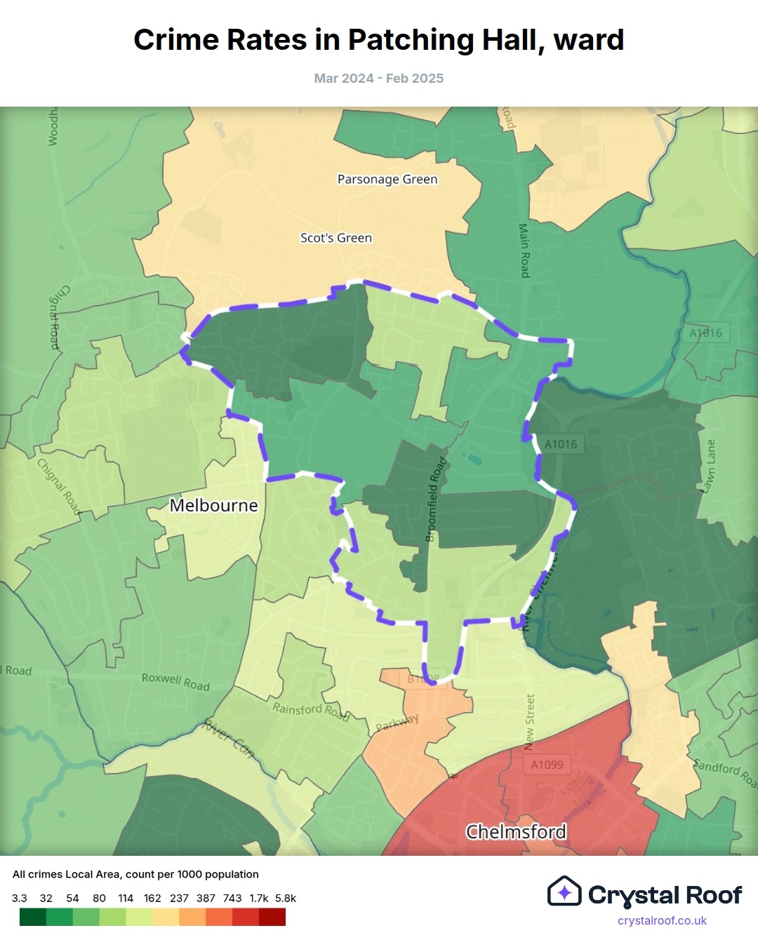 Patching Hall (ward) is located within Chelmsford (borough). Annual total crime rate in Chelmsford (borough) is 80.7 crimes per thousand resident population, which can be rated as 3 out of 10 or low crime level compared to other local authority districts in England and Wales.