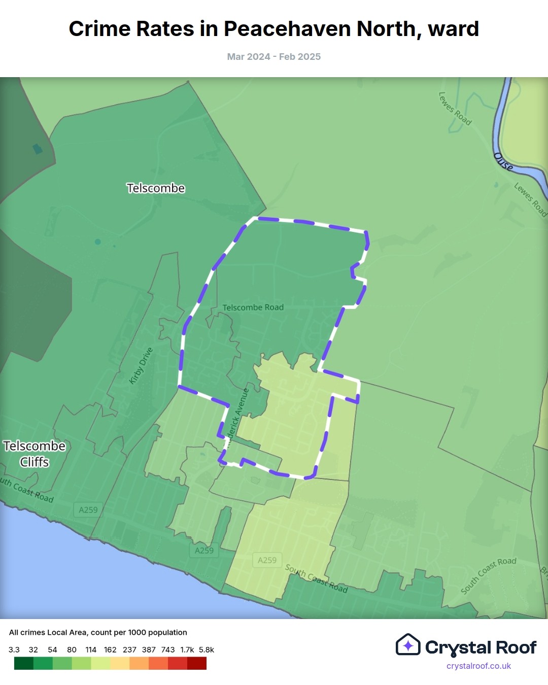 Peacehaven North, (ward) includes areas with the following crime ratings (see map):