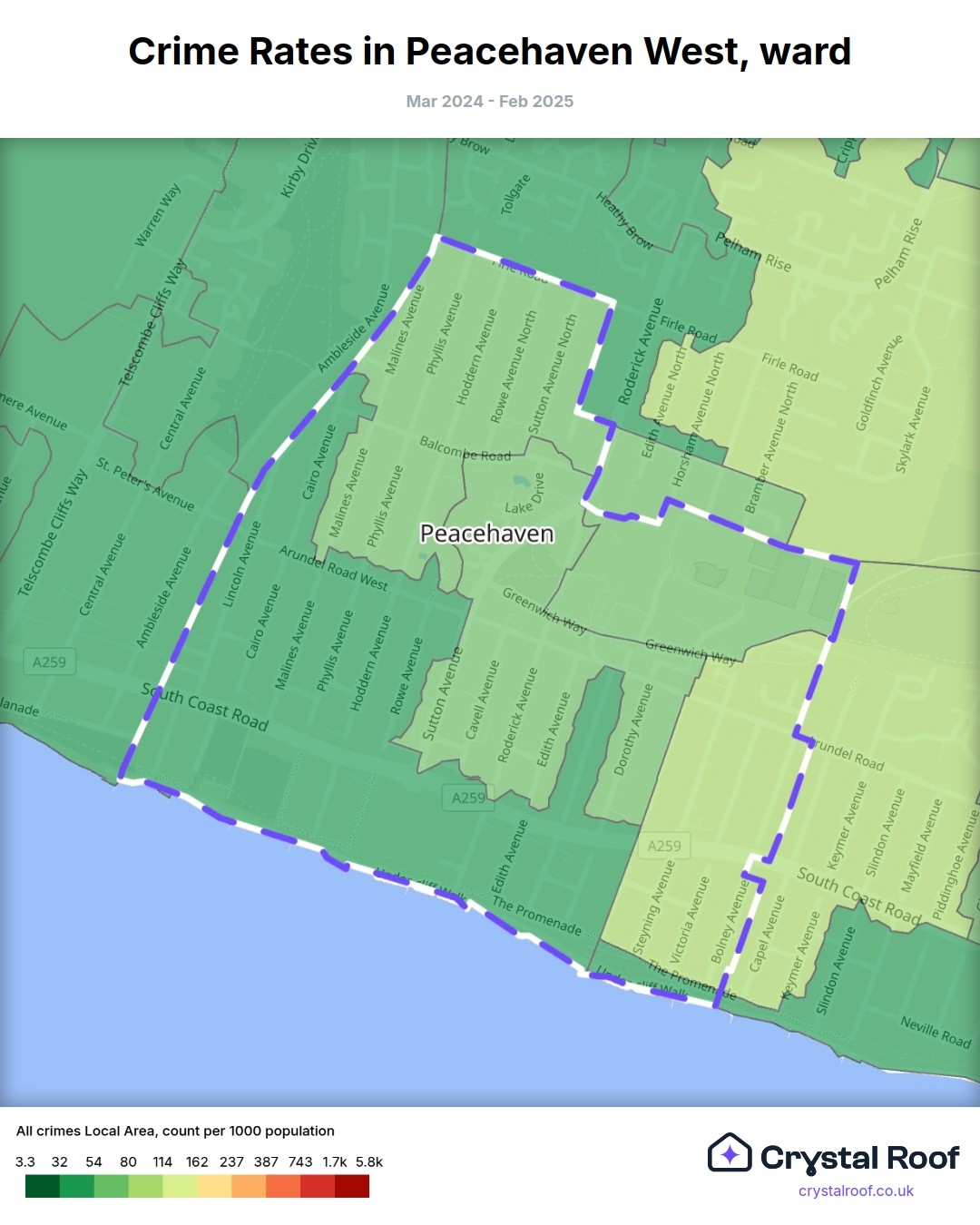 Peacehaven West, (ward) includes areas with the following crime ratings (see map):