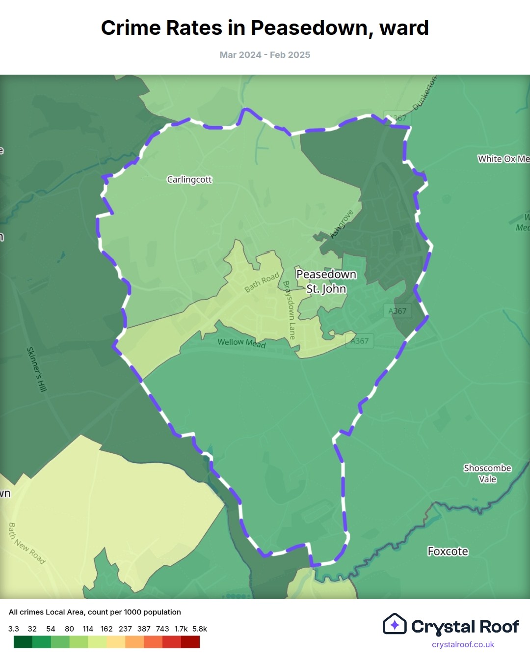 Peasedown, (ward) includes areas with the following crime ratings (see map):