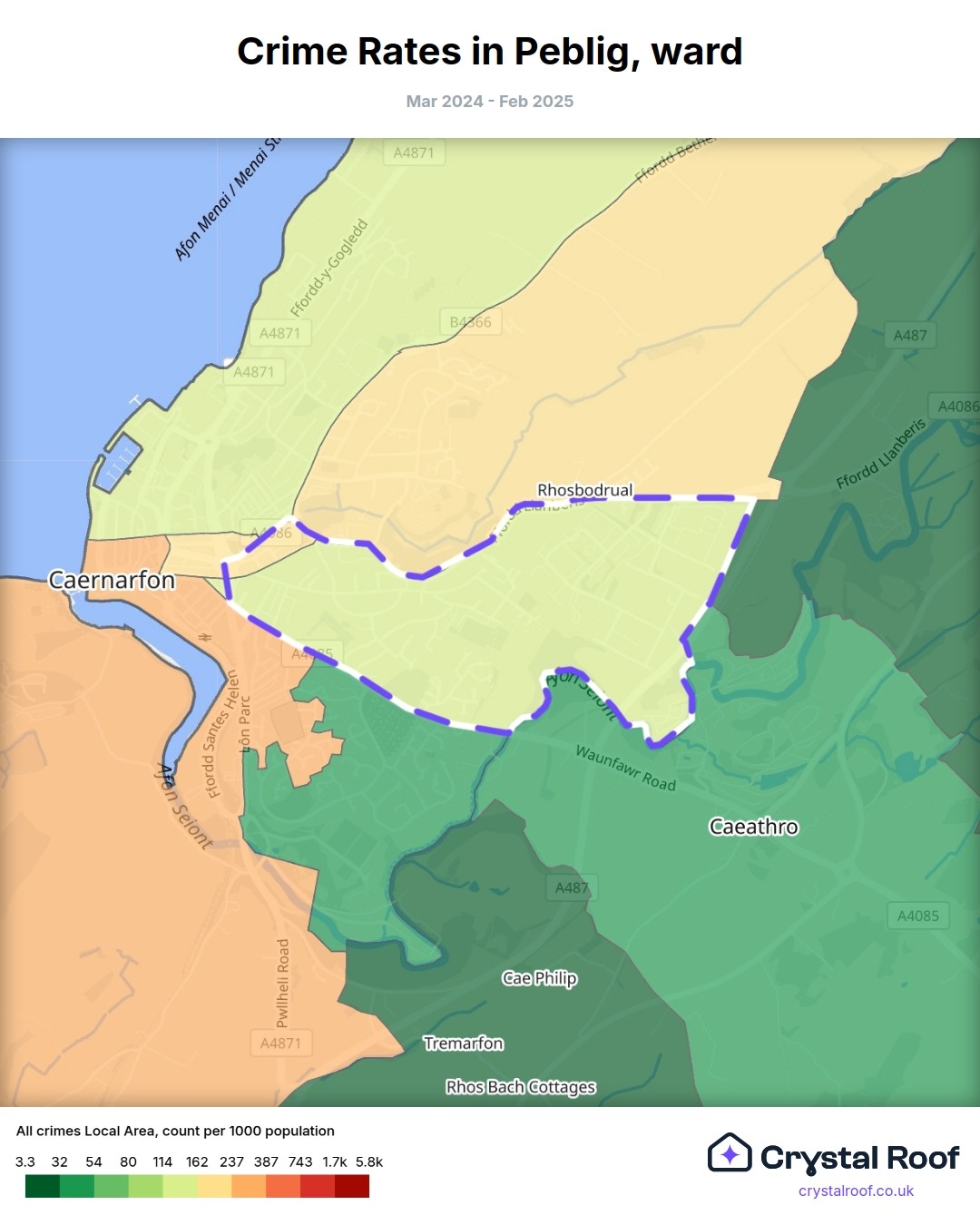 Peblig, (ward) includes areas with the following crime ratings (see map):