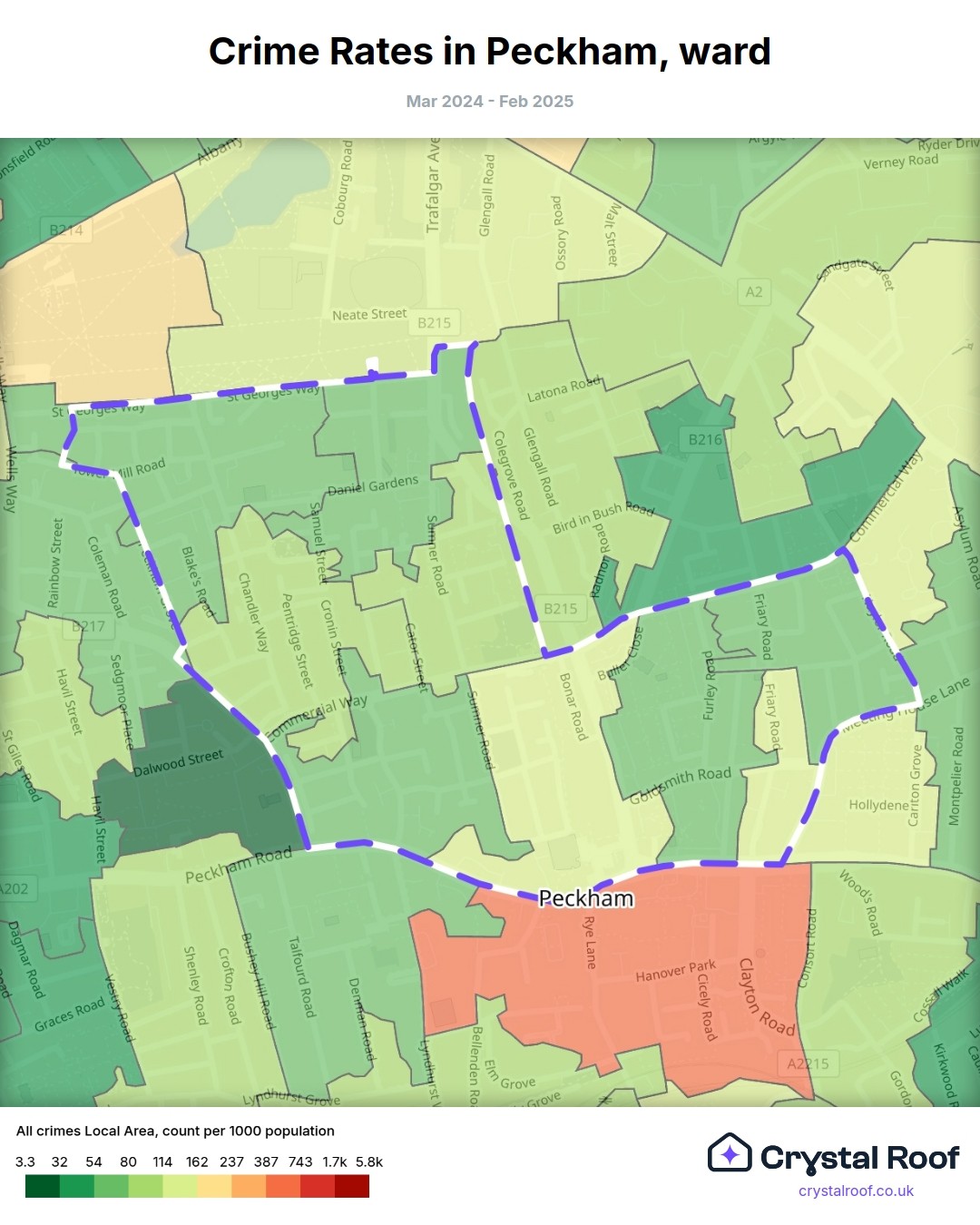 Peckham, (ward) includes areas with the following crime ratings (see map):