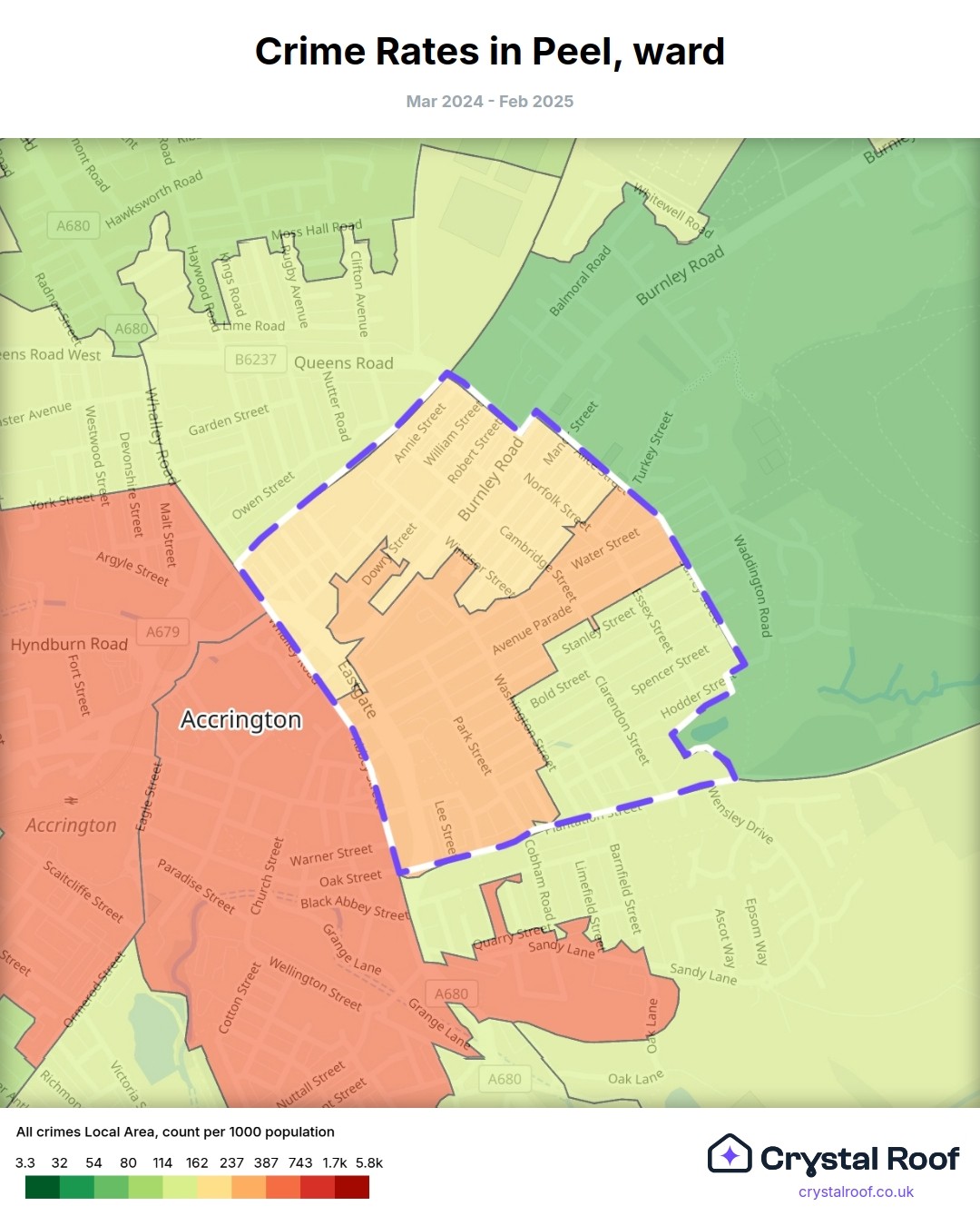 Peel (ward) is located within Hyndburn (borough). Annual total crime rate in Hyndburn (borough) is 141 crimes per thousand resident population, which can be rated as 7 out of 10 or high crime level compared to other local authority districts in England and Wales.