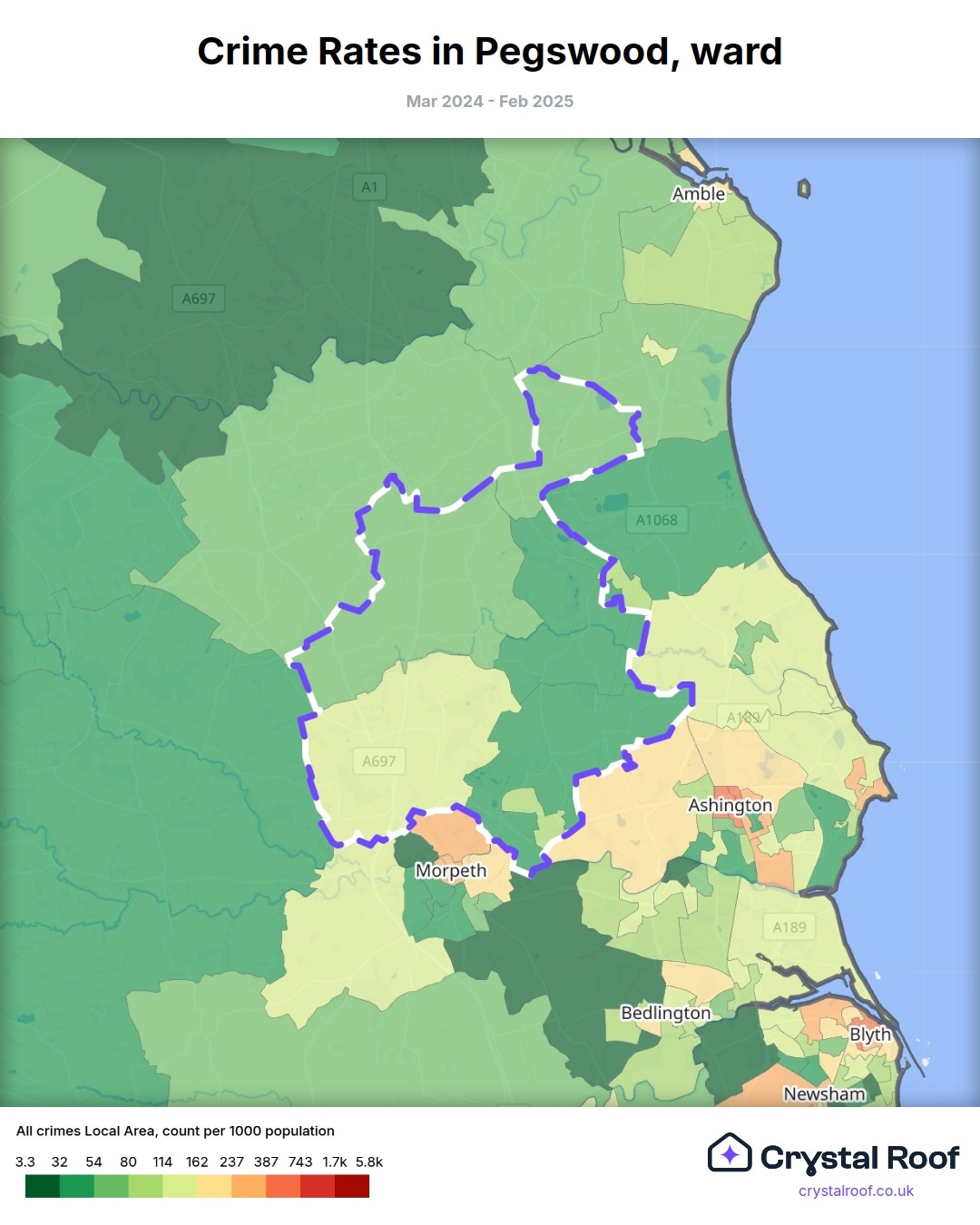 Pegswood, (ward) includes areas with the following crime ratings (see map):