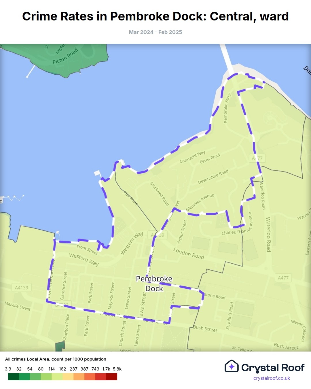 Pembroke Dock: Central (ward) is located within Pembrokeshire (borough). Annual total crime rate in Pembrokeshire (borough) is 85 crimes per thousand resident population, which can be rated as 3 out of 10 or low crime level compared to other local authority districts in England and Wales.