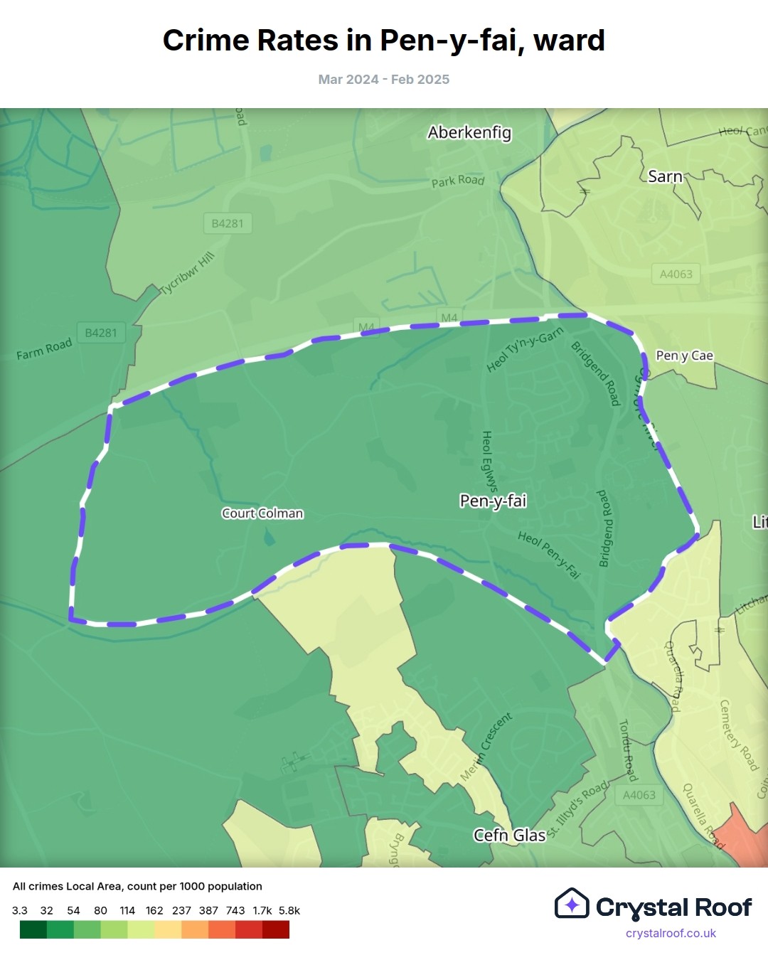 The figures in grey indicate the relative ratings of Pen-y-fai (ward) for a specific crime type compared to other wards in England and Wales.