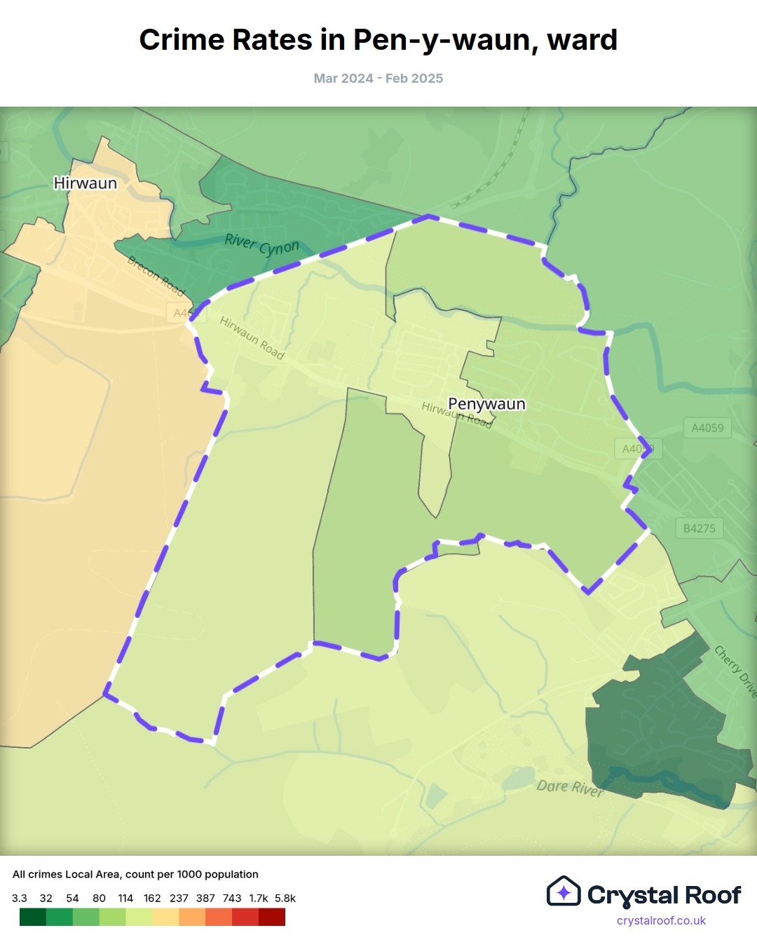 Pen-y-waun, (ward) includes areas with the following crime ratings (see map):