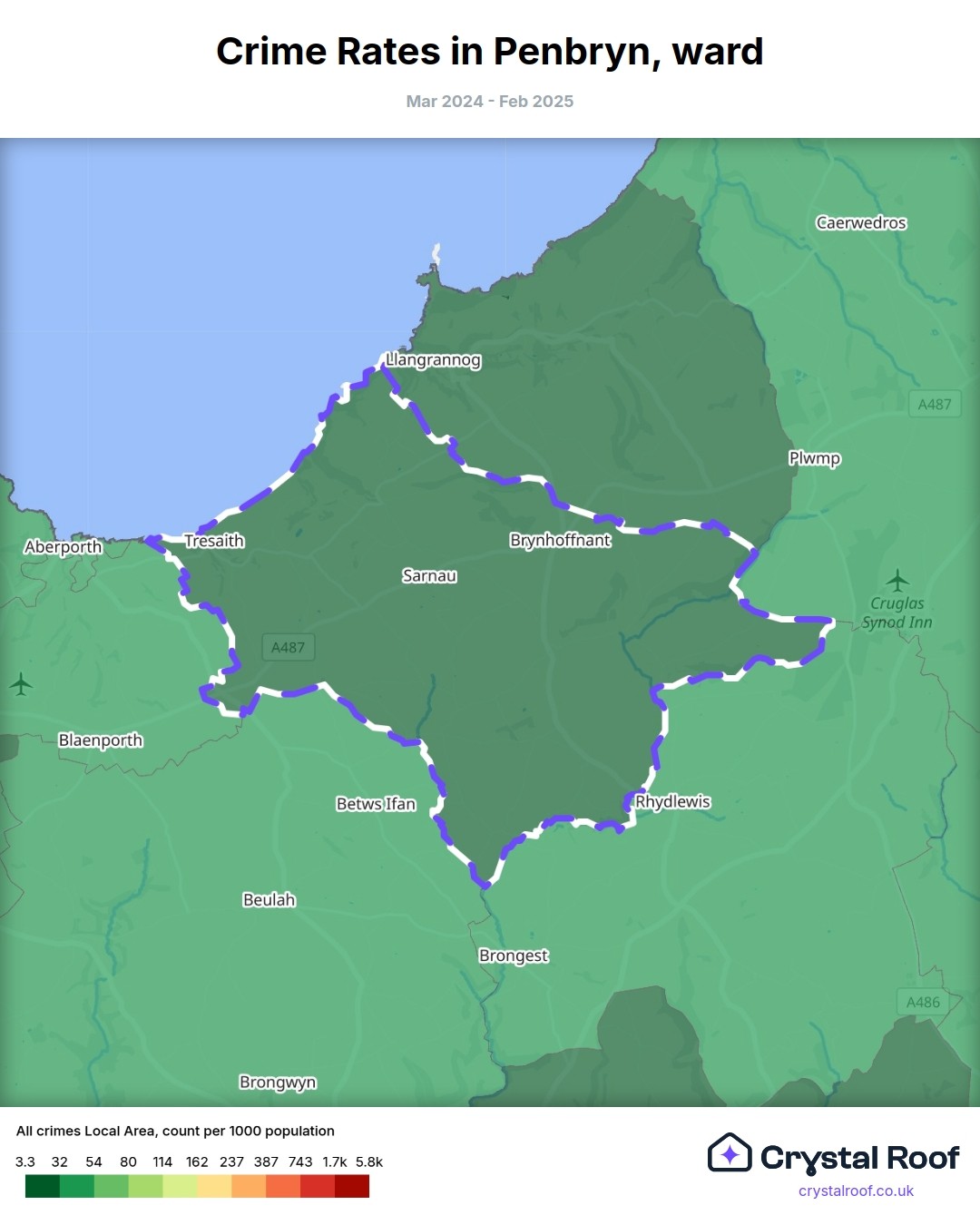 Penbryn (ward) is located within Ceredigion (borough). Annual total crime rate in Ceredigion (borough) is 68.5 crimes per thousand resident population, which can be rated as 2 out of 10 or low crime level compared to other local authority districts in England and Wales.