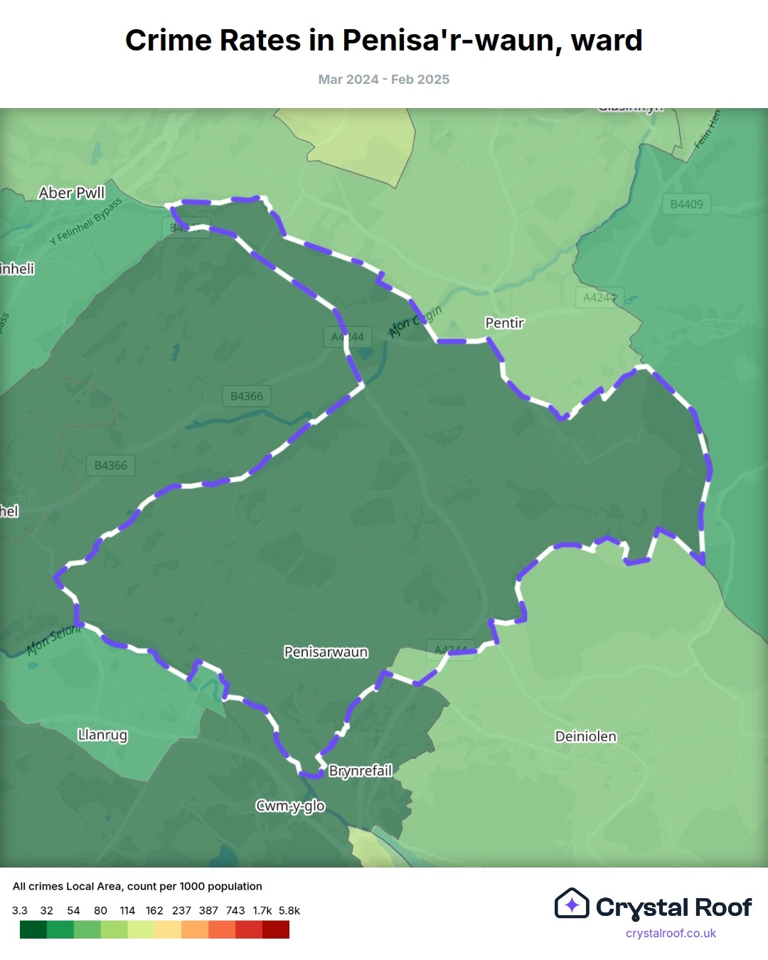 The figures in grey indicate the relative ratings of Penisa'r-waun (ward) for a specific crime type compared to other wards in England and Wales.