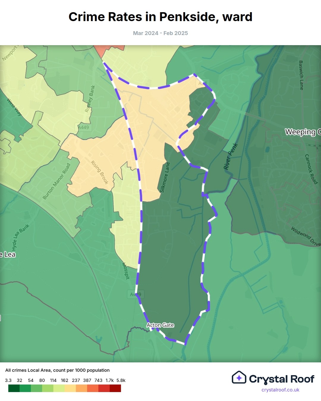 The figures in grey indicate the relative ratings of Penkside (ward) for a specific crime type compared to other wards in England and Wales.