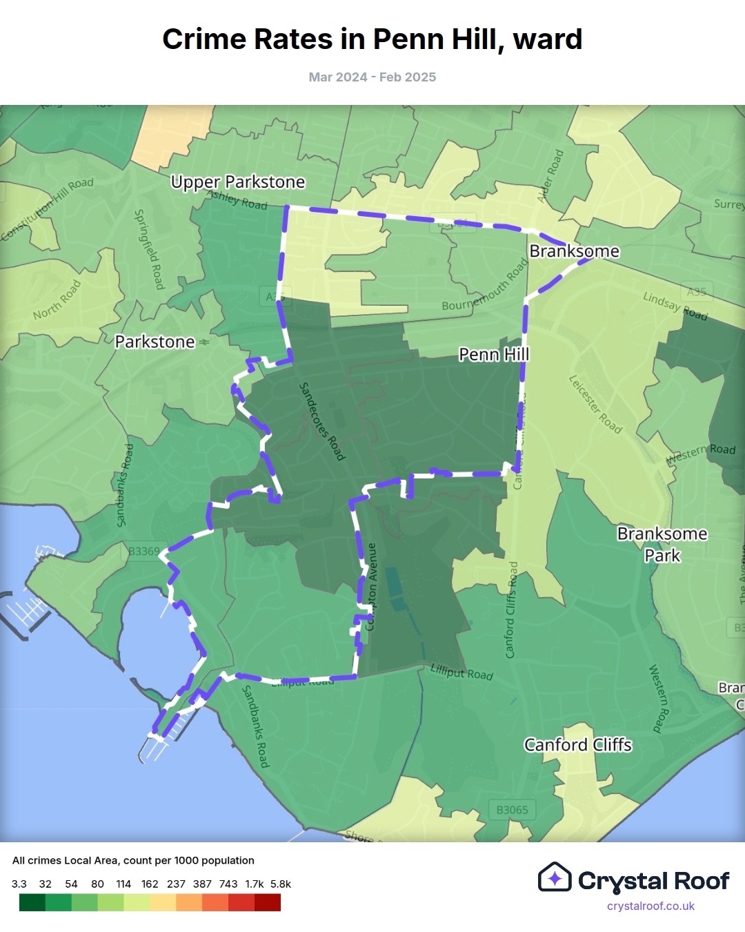 The figures in grey indicate the relative ratings of Penn Hill (ward) for a specific crime type compared to other wards in England and Wales.