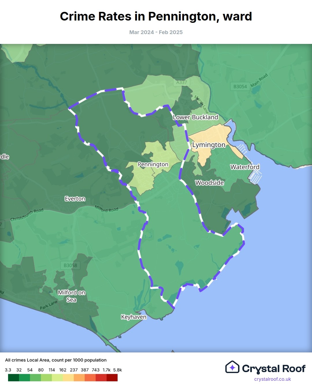 Annual total crime rate in Pennington (ward) is 53.5 per thousand resident population. This can be rated as 2 out of 10 or low crime level compared to other wards in England and Wales.