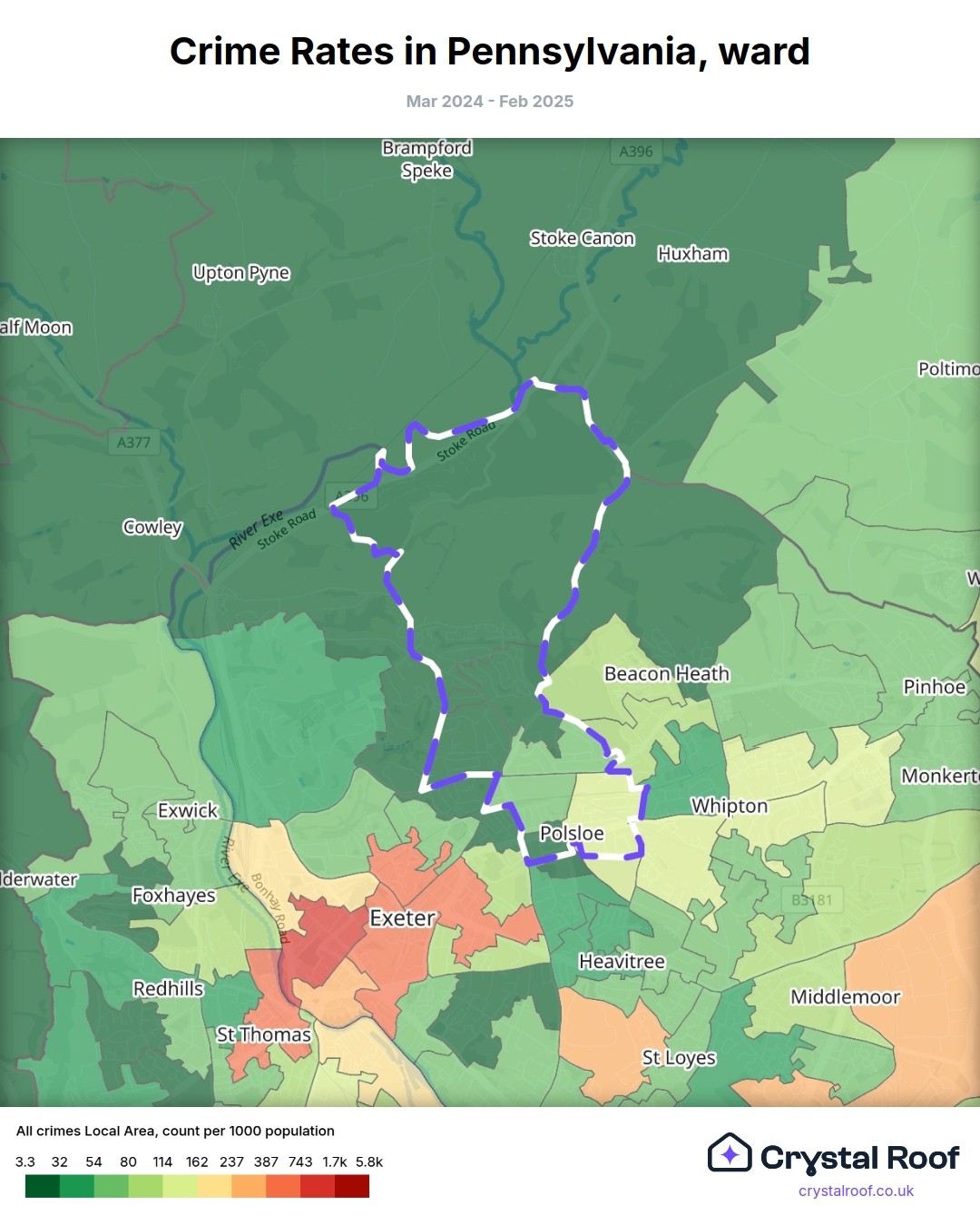 Pennsylvania (ward) is located within Exeter (borough). Annual total crime rate in Exeter (borough) is 121 crimes per thousand resident population, which can be rated as 6 out of 10 or medium crime level compared to other local authority districts in England and Wales.