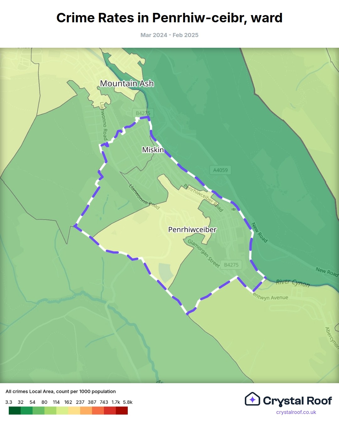 Penrhiw-ceibr (ward) is located within Rhondda Cynon Taf (borough). Annual total crime rate in Rhondda Cynon Taf (borough) is 89 crimes per thousand resident population, which can be rated as 4 out of 10 or low crime level compared to other local authority districts in England and Wales.