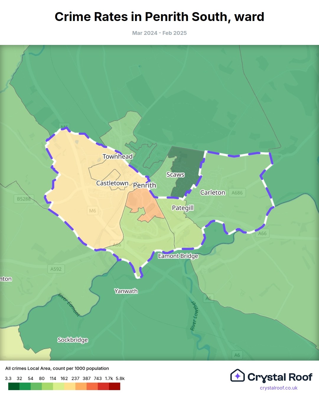 The figures in grey indicate the relative ratings of Penrith South (ward) for a specific crime type compared to other wards in England and Wales.