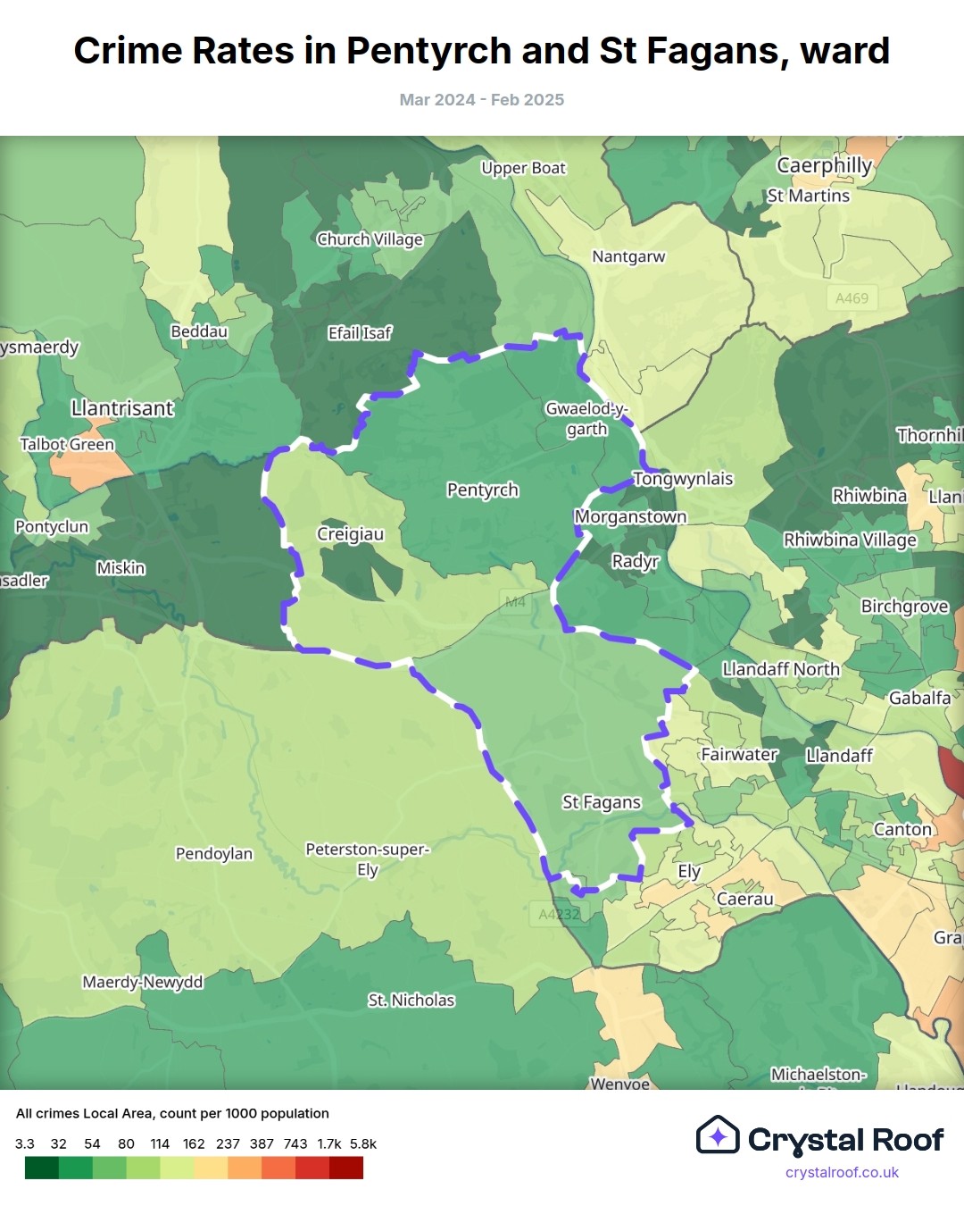 Pentyrch and St Fagans, (ward) includes areas with the following crime ratings (see map):