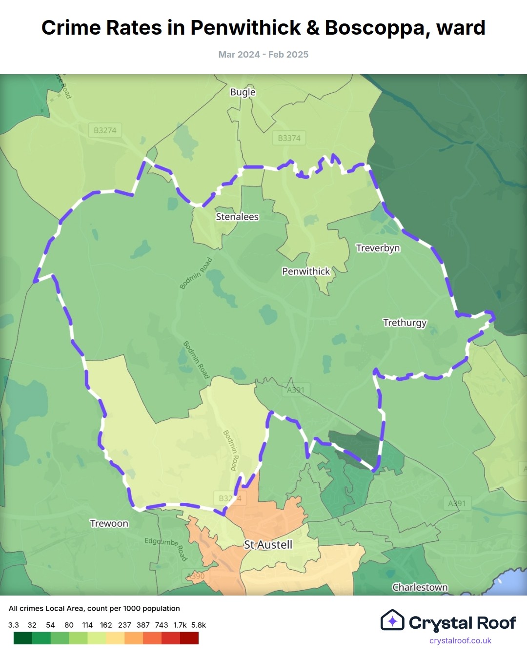 Penwithick & Boscoppa, (ward) includes areas with the following crime ratings (see map):