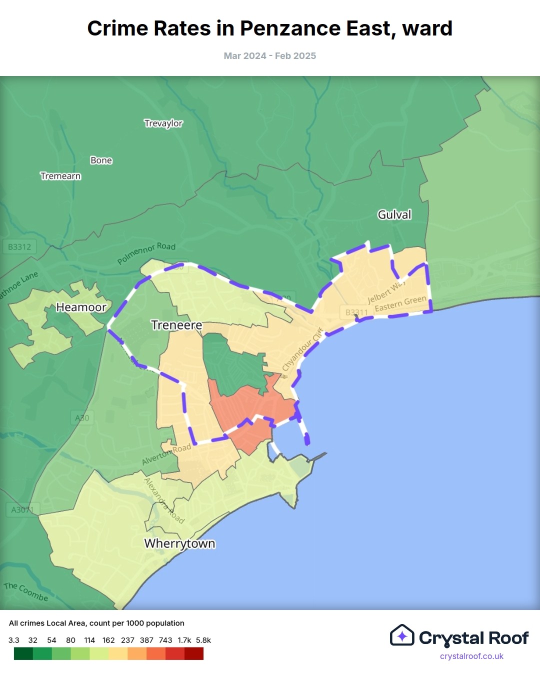 Penzance East, (ward) includes areas with the following crime ratings (see map):