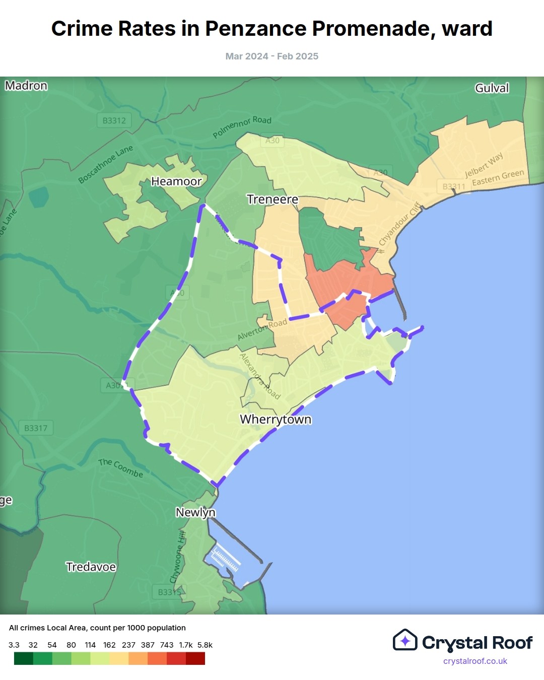 Penzance Promenade, (ward) includes areas with the following crime ratings (see map):