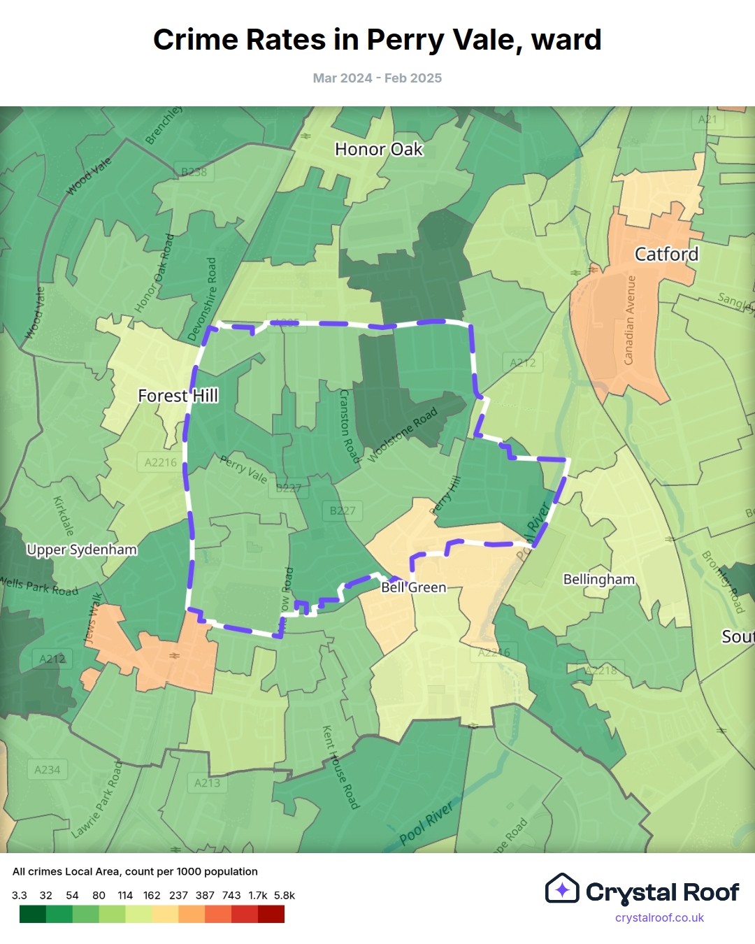 Perry Vale, (ward) includes areas with the following crime ratings (see map):