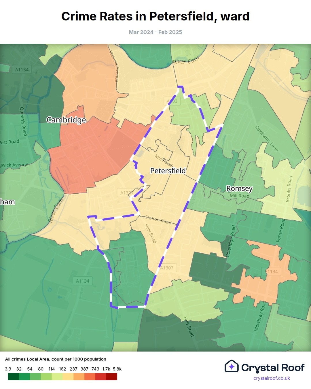 Petersfield (ward) is located within Cambridge (borough). Annual total crime rate in Cambridge (borough) is 113 crimes per thousand resident population, which can be rated as 5 out of 10 or medium crime level compared to other local authority districts in England and Wales.