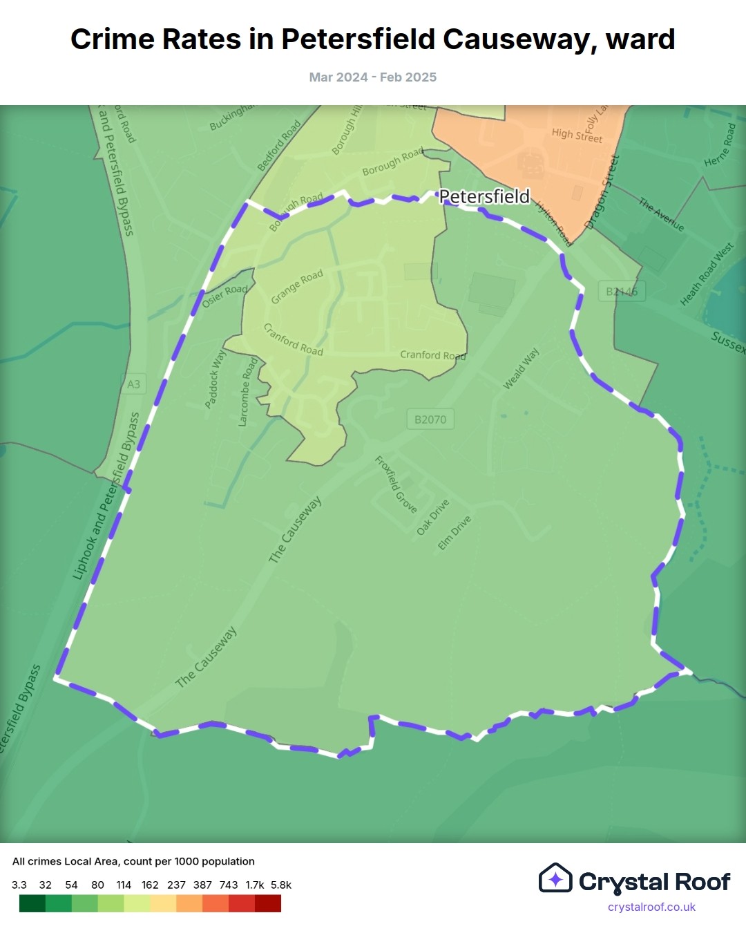 Petersfield Causeway, (ward) includes areas with the following crime ratings (see map):