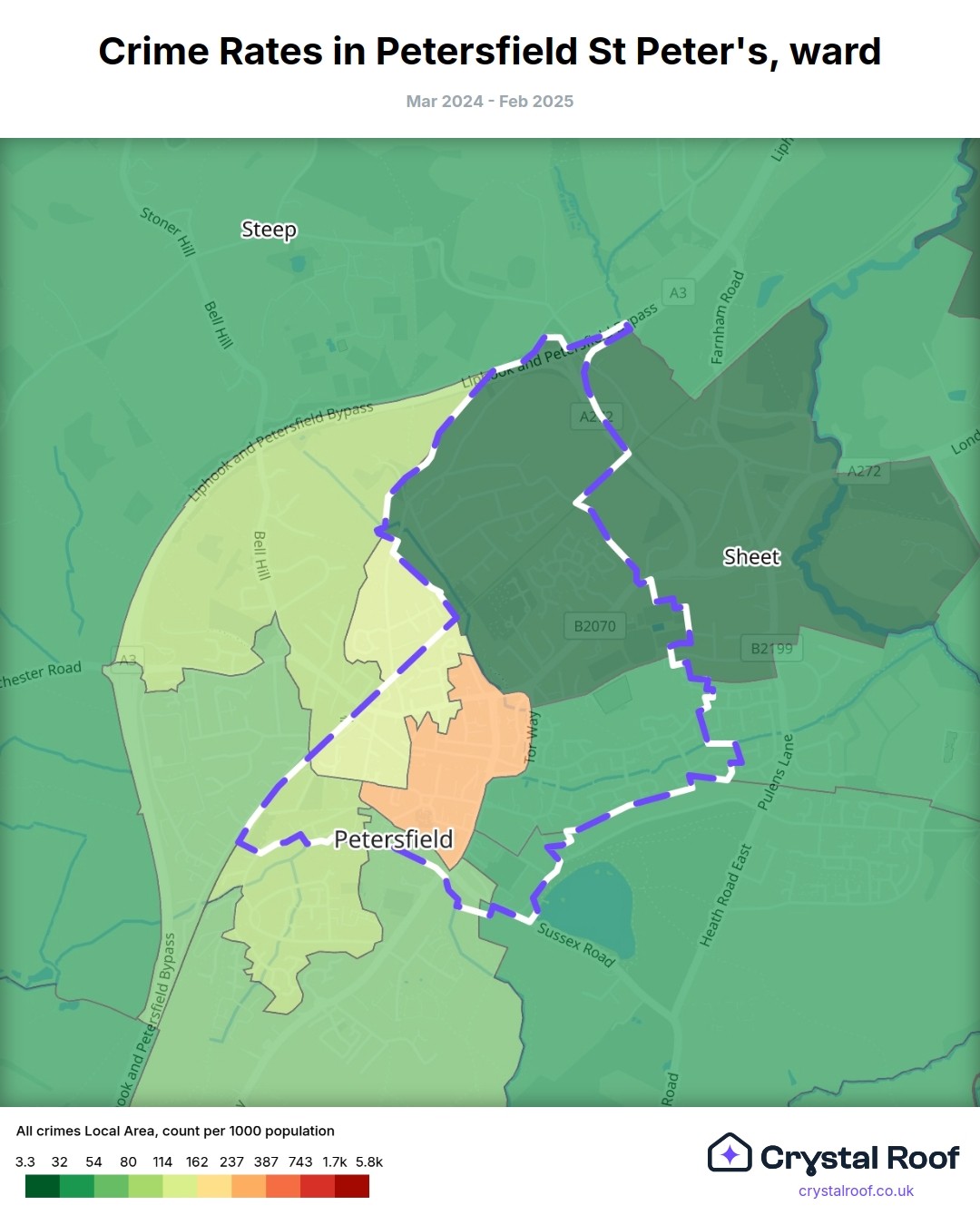 Petersfield St Peter's, (ward) includes areas with the following crime ratings (see map):