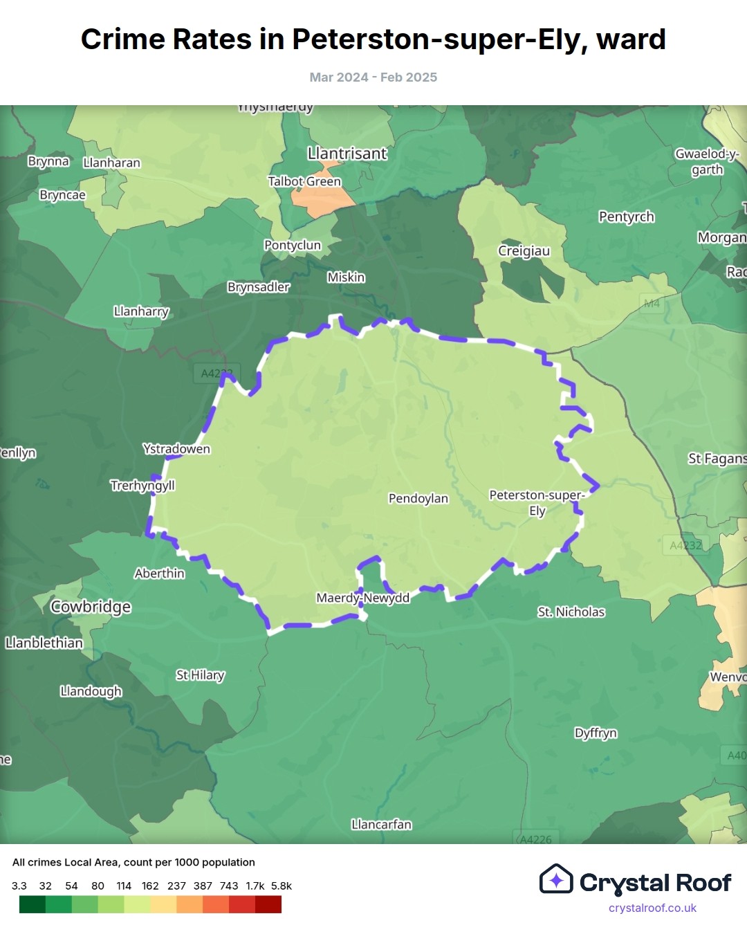 Peterston-super-Ely, (ward) includes areas with the following crime ratings (see map):