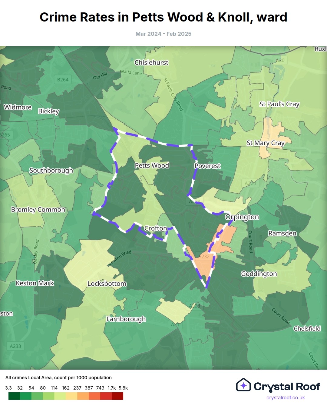 Petts Wood & Knoll, (ward) includes areas with the following crime ratings (see map):