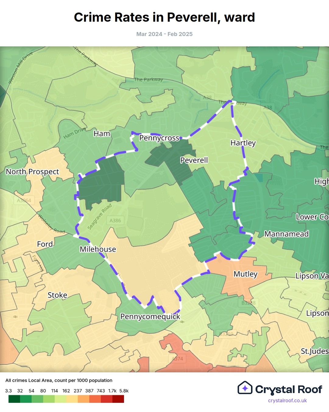 Peverell, (ward) includes areas with the following crime ratings (see map):
