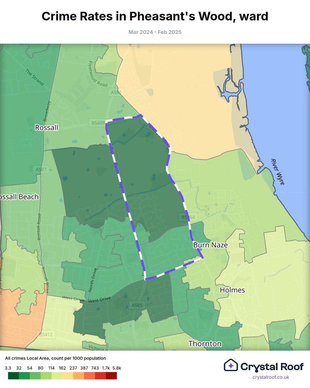 Pheasant's Wood (ward) is located within Wyre (borough). Annual total crime rate in Wyre (borough) is 91.1 crimes per thousand resident population, which can be rated as 4 out of 10 or low crime level compared to other local authority districts in England and Wales.