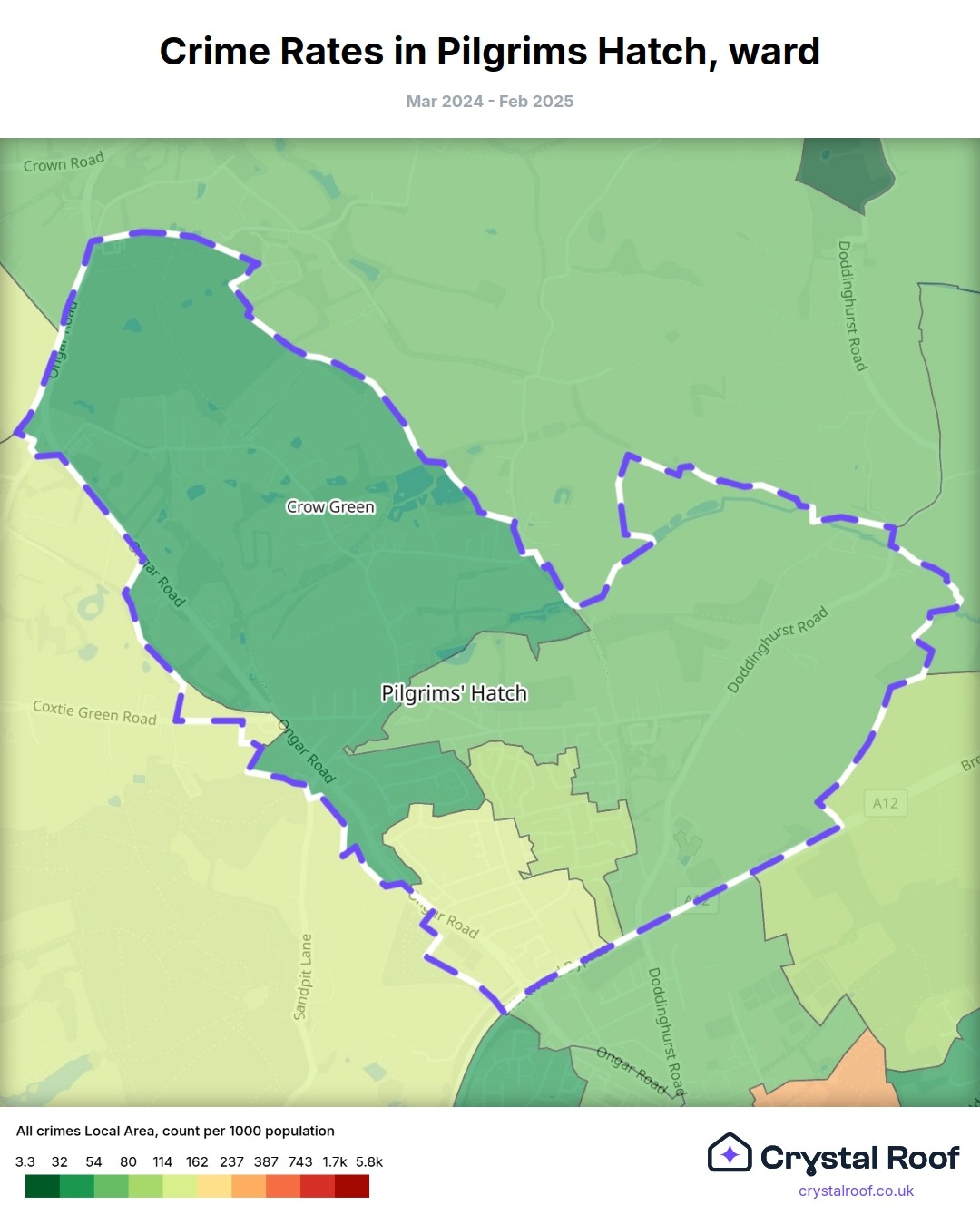 Pilgrims Hatch, (ward) includes areas with the following crime ratings (see map):