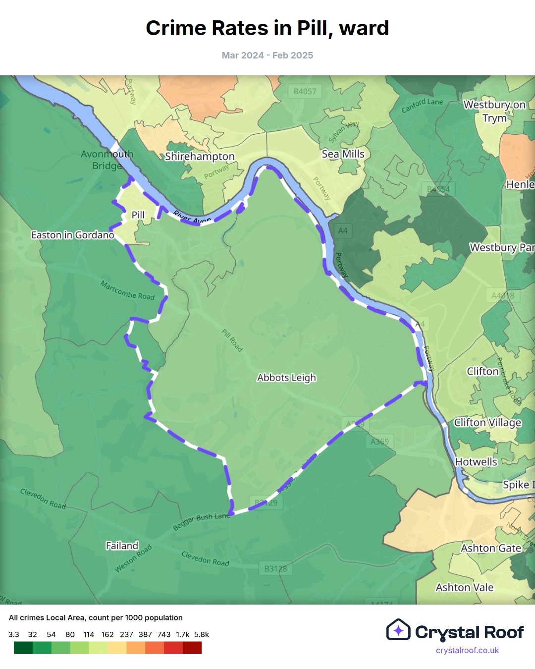 The figures in grey indicate the relative ratings of Pill (ward) for a specific crime type compared to other wards in England and Wales.