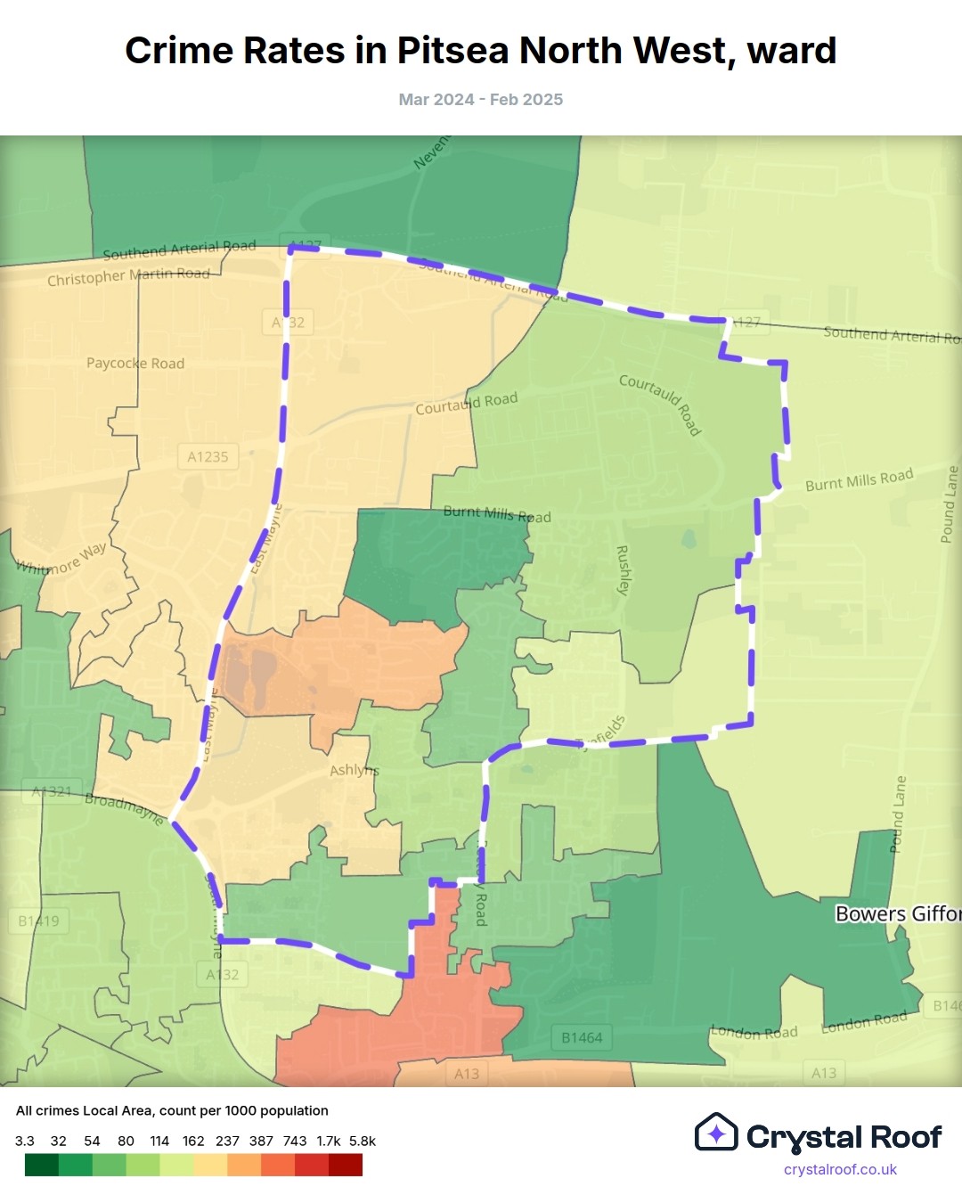 Pitsea North West, (ward) includes areas with the following crime ratings (see map):