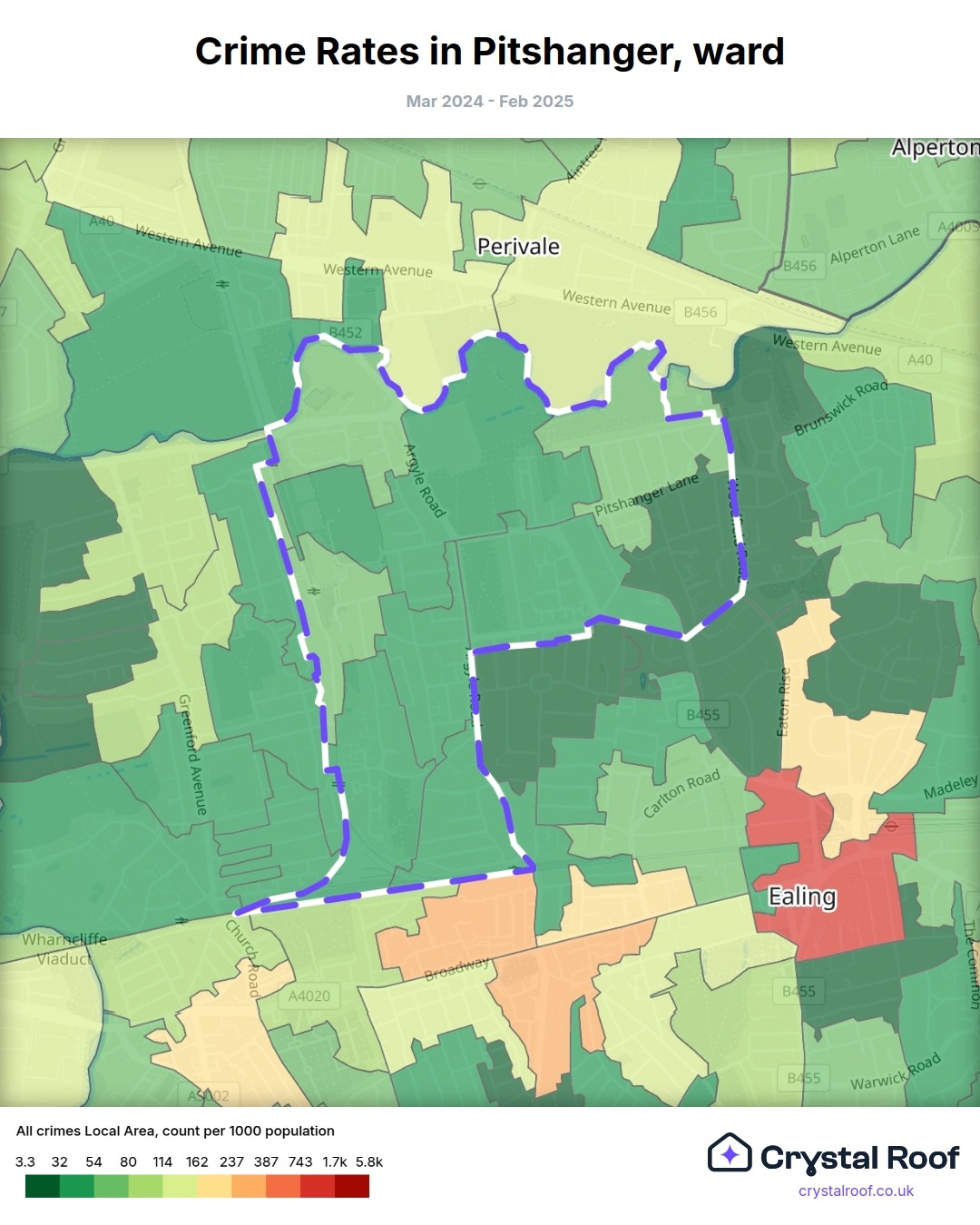 Pitshanger, (ward) includes areas with the following crime ratings (see map):