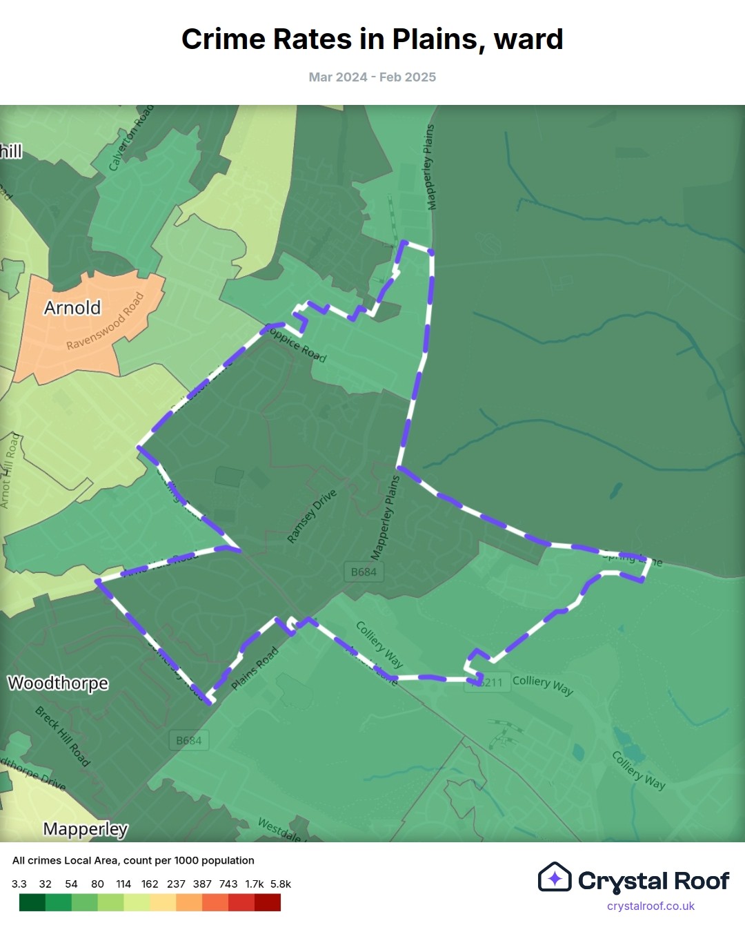 Plains (ward) is located within Gedling (borough). Annual total crime rate in Gedling (borough) is 64.5 crimes per thousand resident population, which can be rated as 2 out of 10 or low crime level compared to other local authority districts in England and Wales.