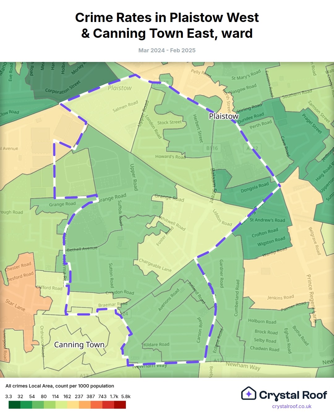 The figures in grey indicate the relative ratings of Plaistow West & Canning Town East (ward) for a specific crime type compared to other wards in England and Wales.
