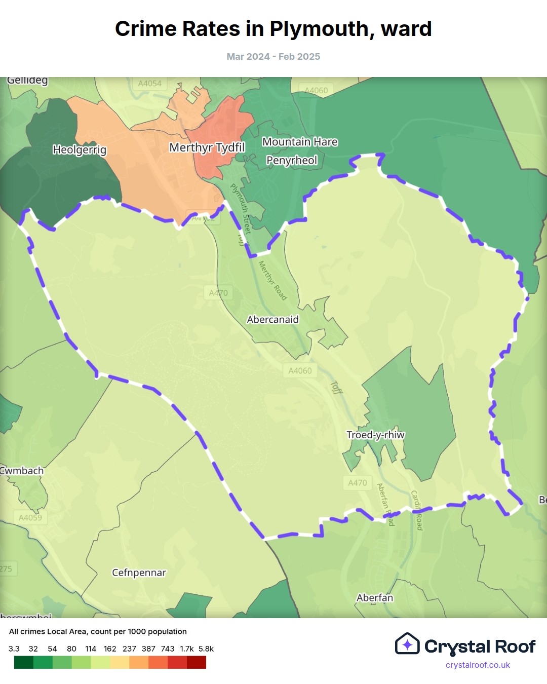 Plymouth (ward) is located within Merthyr Tydfil (borough). Annual total crime rate in Merthyr Tydfil (borough) is 111 crimes per thousand resident population, which can be rated as 5 out of 10 or medium crime level compared to other local authority districts in England and Wales.