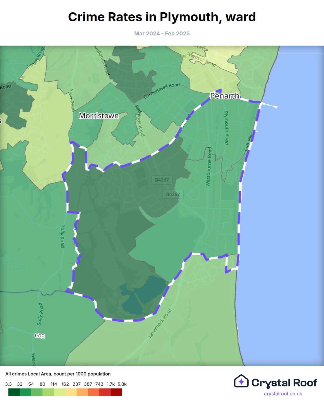 Plymouth (ward) is located within Vale of Glamorgan (borough). Annual total crime rate in Vale of Glamorgan (borough) is 74.7 crimes per thousand resident population, which can be rated as 3 out of 10 or low crime level compared to other local authority districts in England and Wales.