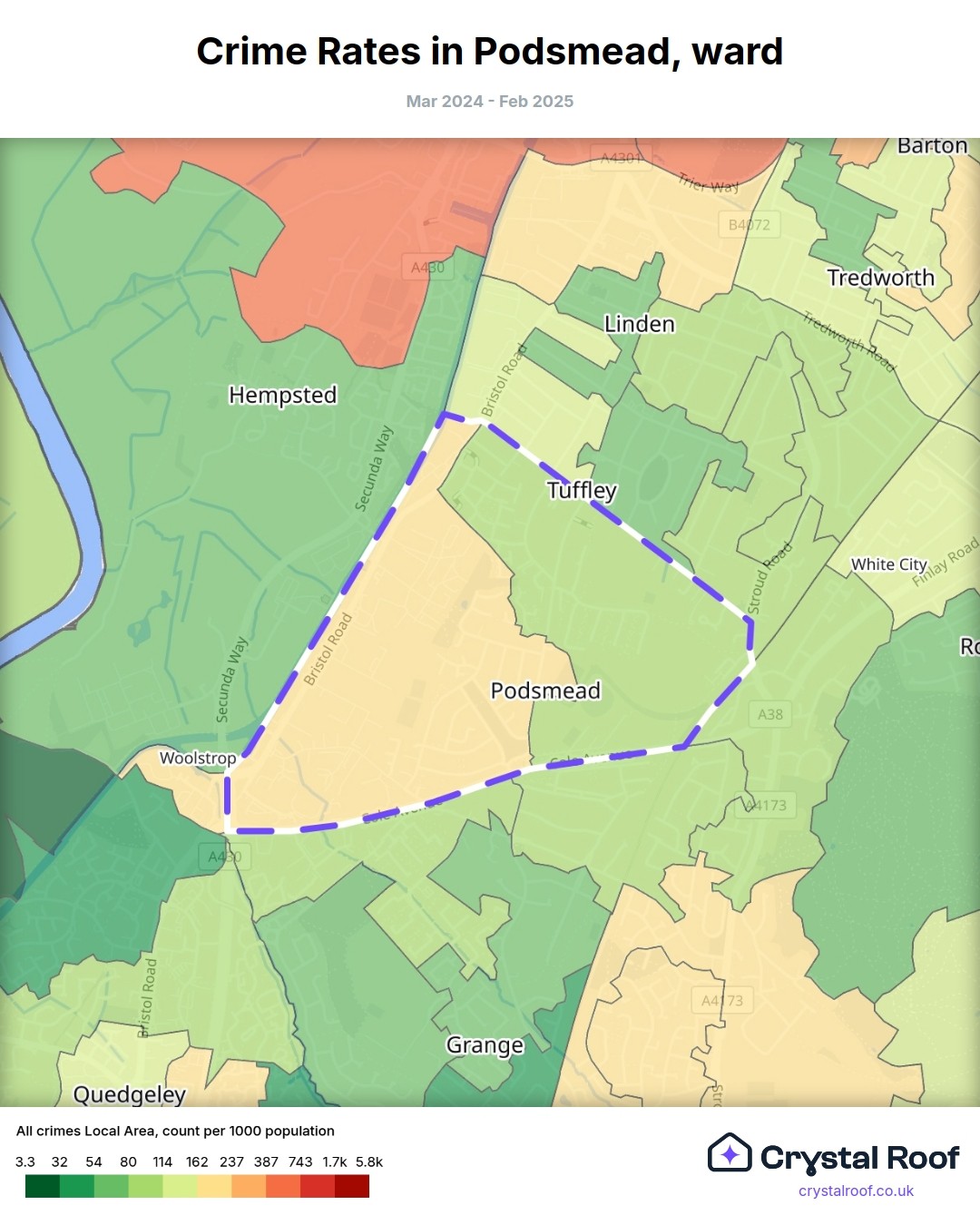 Podsmead, (ward) includes areas with the following crime ratings (see map):