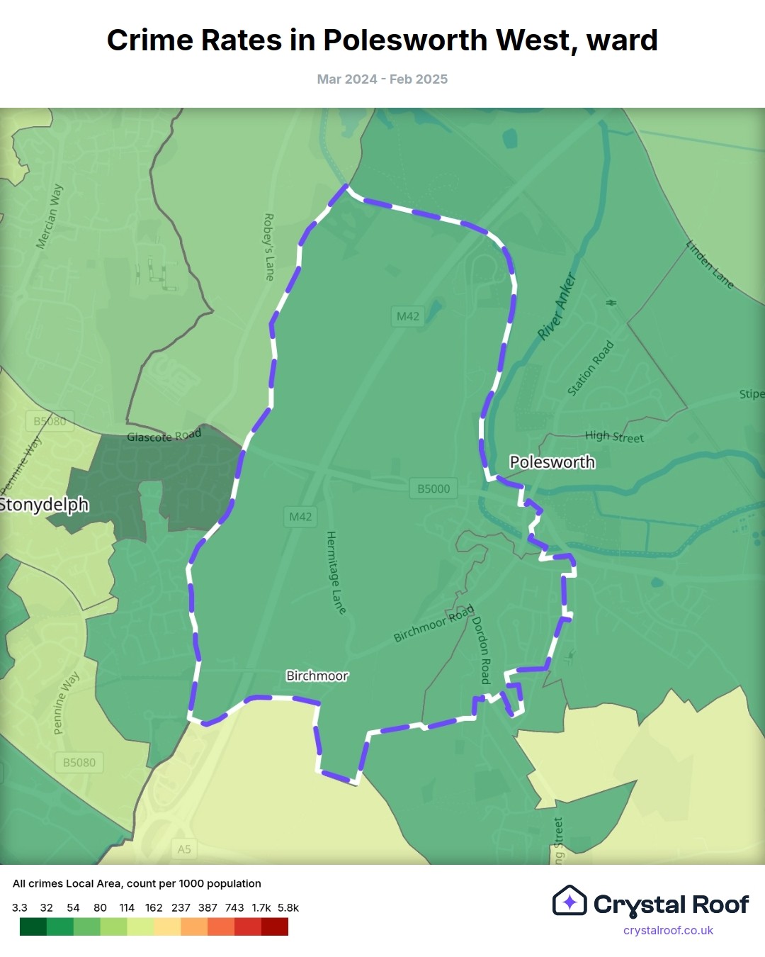Polesworth West, (ward) includes areas with the following crime ratings (see map):