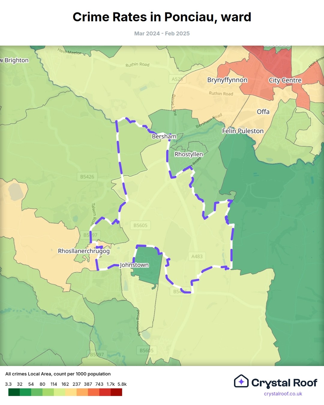 Ponciau, (ward) includes areas with the following crime ratings (see map):