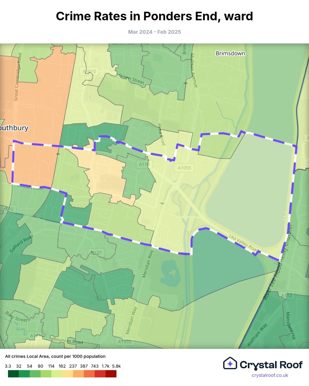 Ponders End, (ward) includes areas with the following crime ratings (see map):