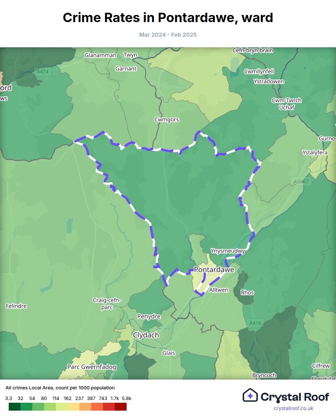 The figures in grey indicate the relative ratings of Pontardawe (ward) for a specific crime type compared to other wards in England and Wales.