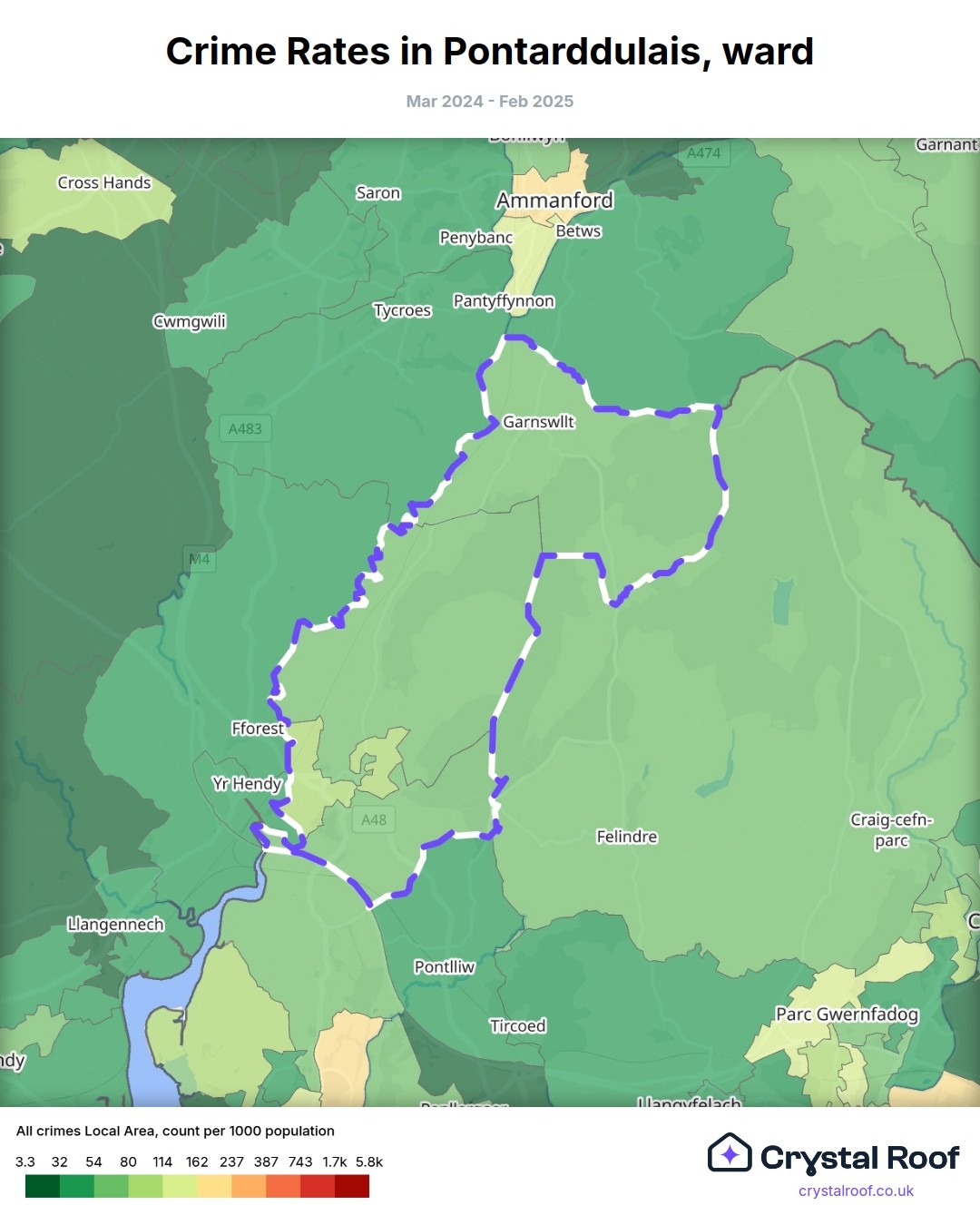 Pontarddulais, (ward) includes areas with the following crime ratings (see map):