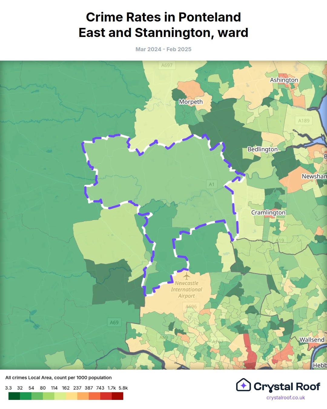 Ponteland East & Stannington, (ward) includes areas with the following crime ratings (see map):