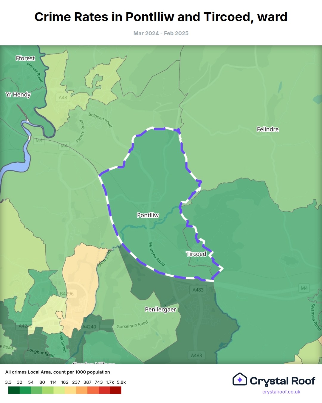 Pontlliw and Tircoed, (ward) includes areas with the following crime ratings (see map):