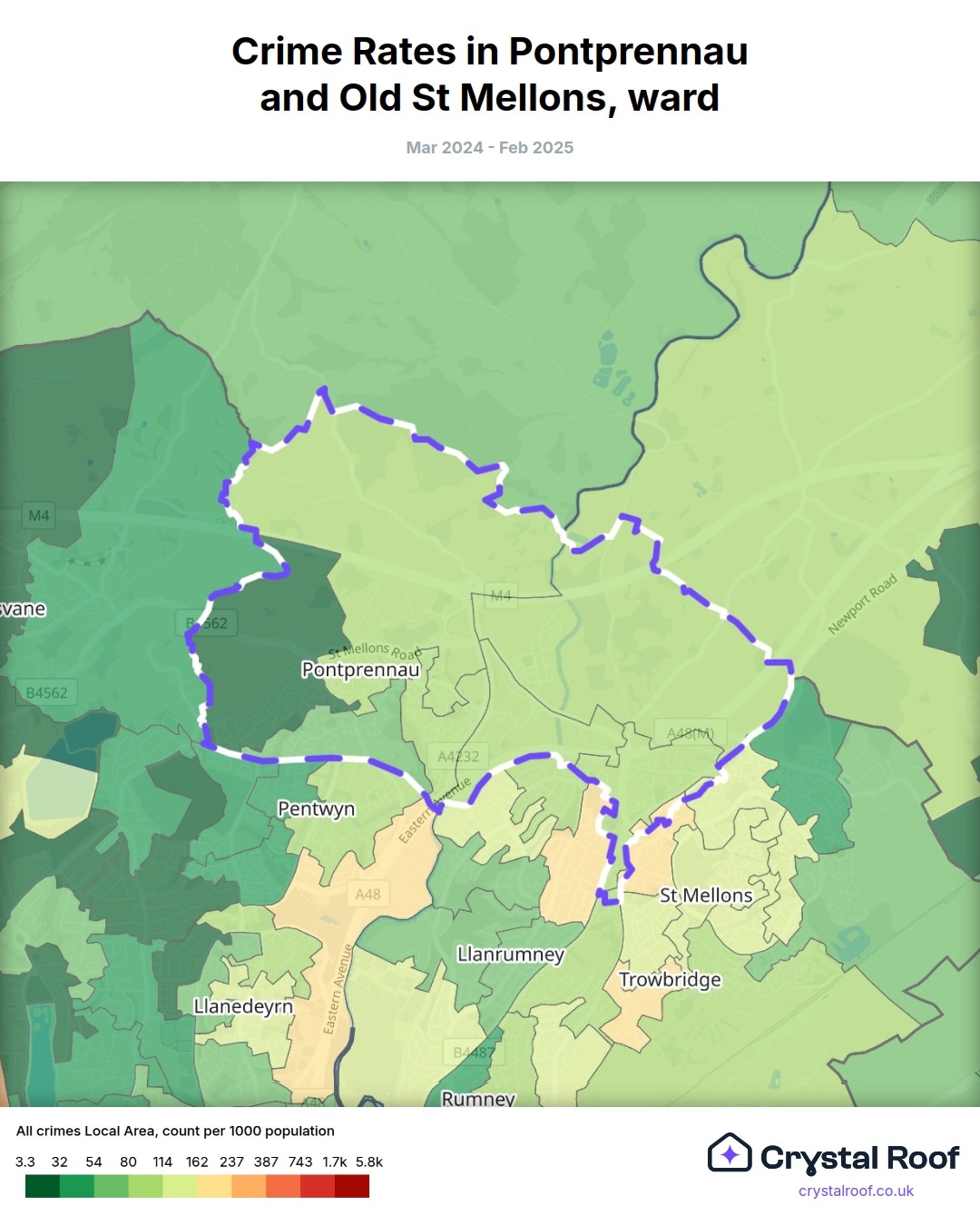 Pontprennau and Old St Mellons, (ward) includes areas with the following crime ratings (see map):
